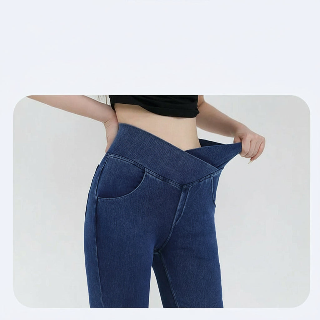 Designed for the modern woman, these high-waist flare jeans combine timeless style with contemporary comfort. The expertly crafted blend of cotton, polyester, and spandex provides a supple stretch that moves with your body, while the elastic waistband offers a secure, flattering fit. True-to-size proportions and a graceful flared leg create an elongating silhouette perfect for any occasion. Seamless construction and functional straight pockets complete this versatile wardrobe essential that effortlessly transitions from day to evening wear.