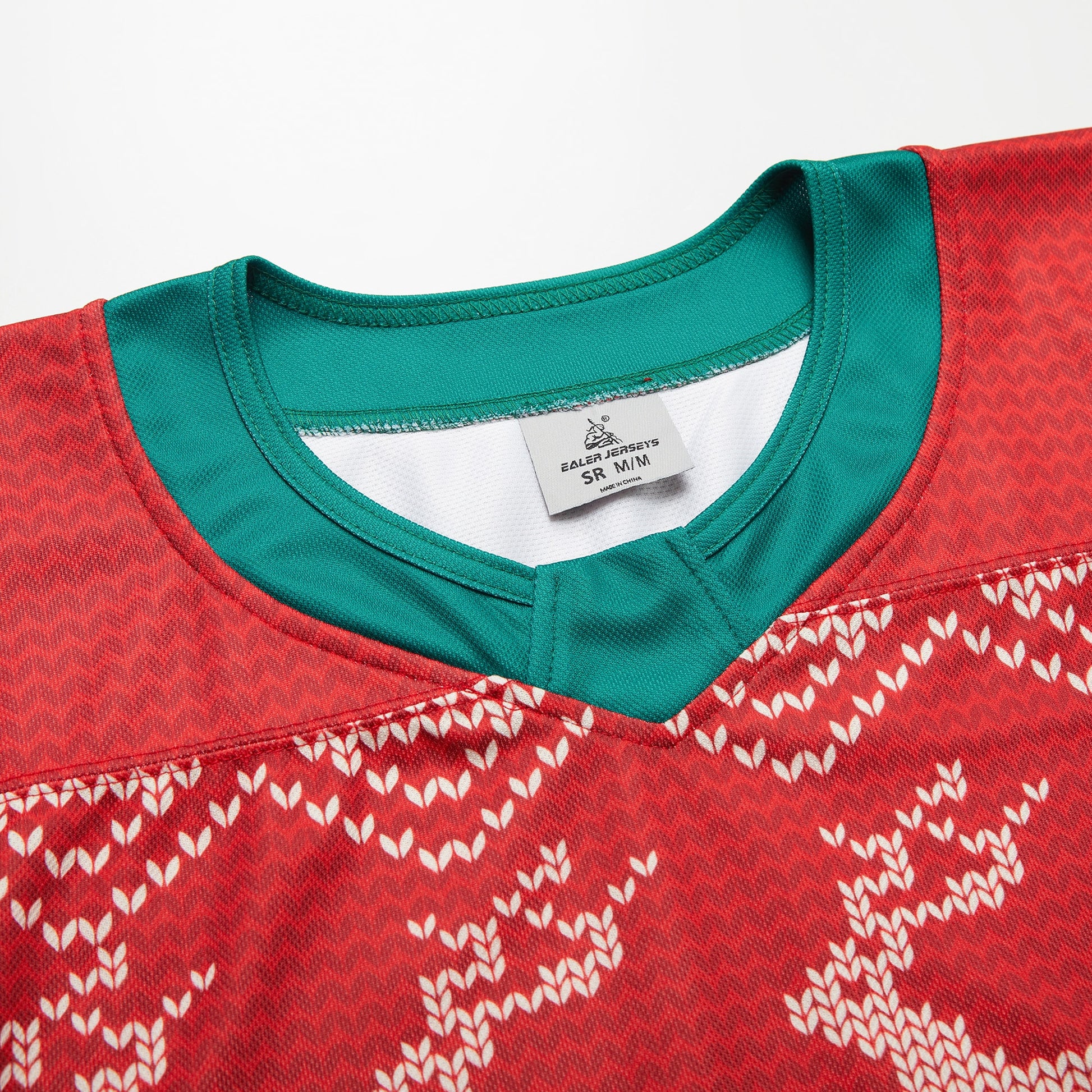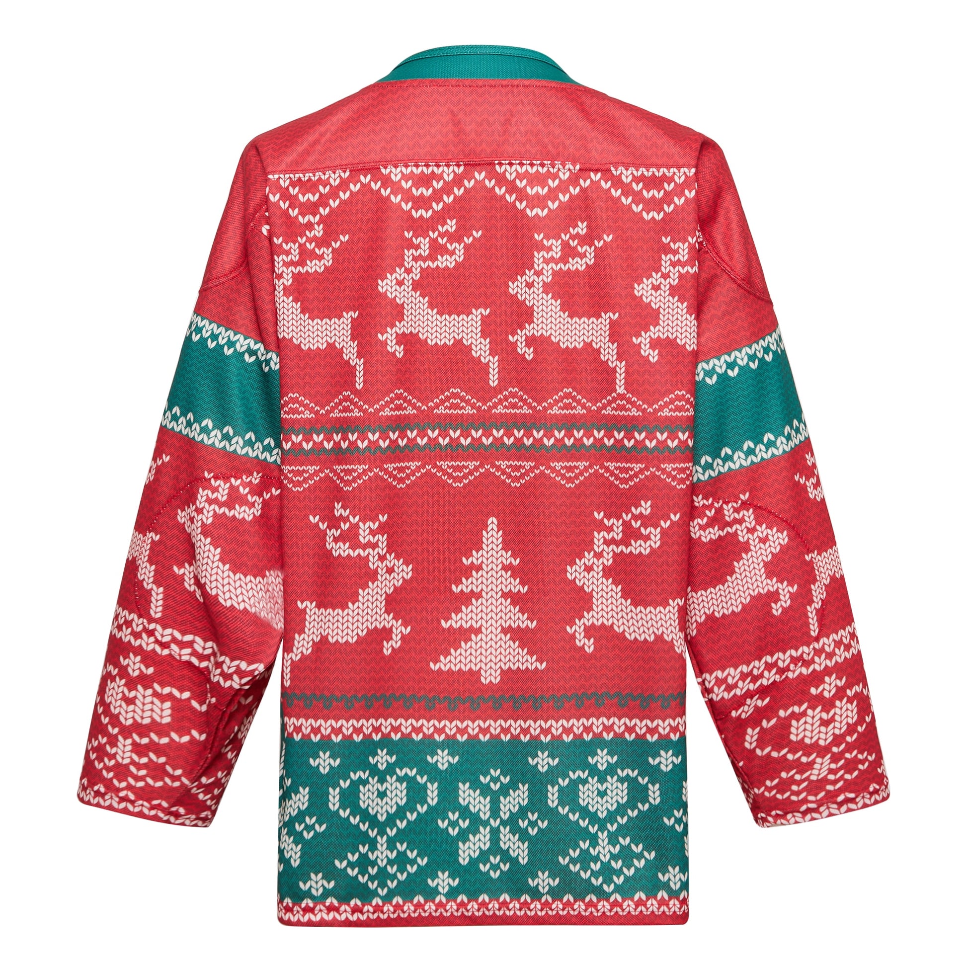 This Christmas Sweater Hockey Jersey is crafted from polyester, a durable and lightweight material.